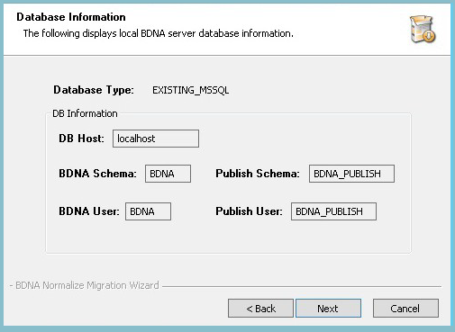 - On the Database Information screen, the host, schema, and user information is displayed.